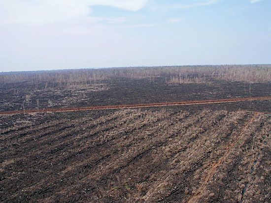 Original, drained and deforested tropical peatland in central Sumatra, Indonesia.